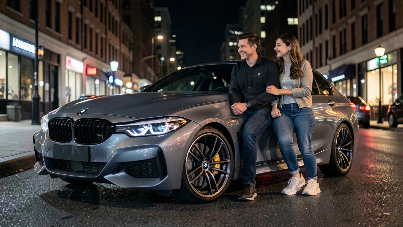 Generate a commercial photoshoot of BMW M5, couple interacting with car, city street at night, 4K, precise details on wheels and paint, high detail, 4K resolution