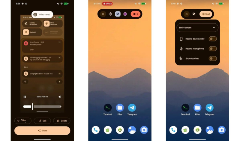 Перезапустите, и инструмент запишет экран. Громоздкий старый интерфейс заменяют на аккуратную плавающую панель в стиле Material 3 Expressive. Меню открывается по нажатию, открывая доступ к выбору источника звука (системы или микрофона) и включению касаний. После завершения записи всплывает меню для быстрого редактирования или отправки файла.